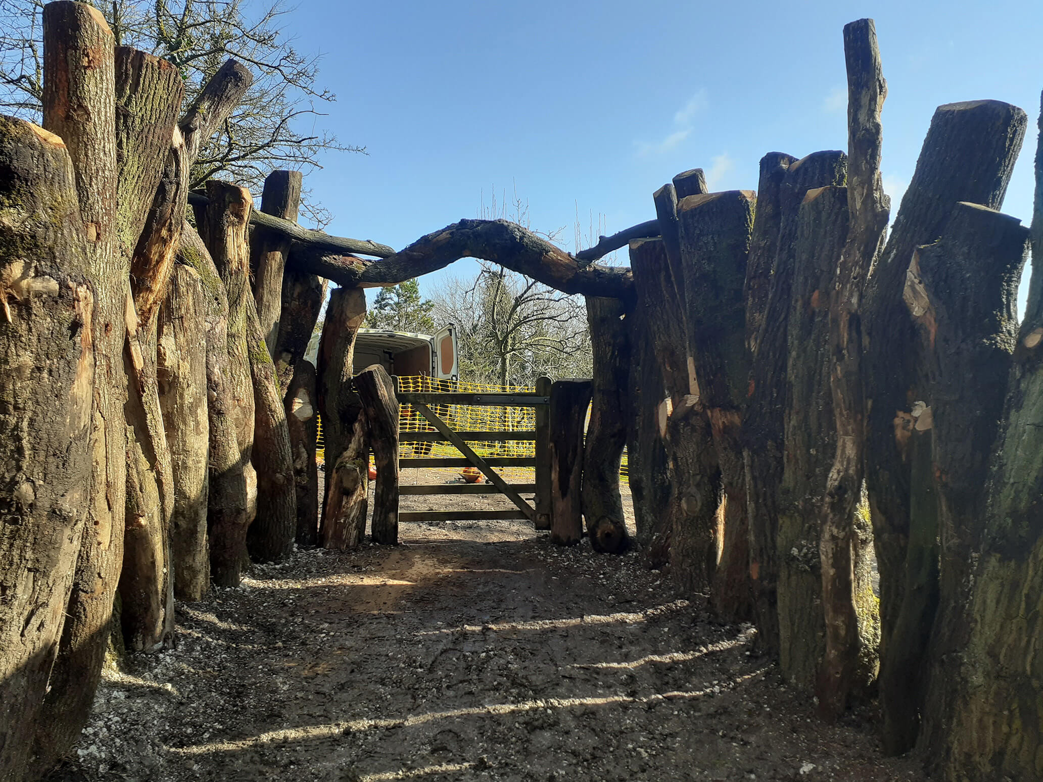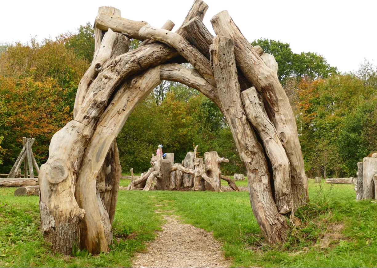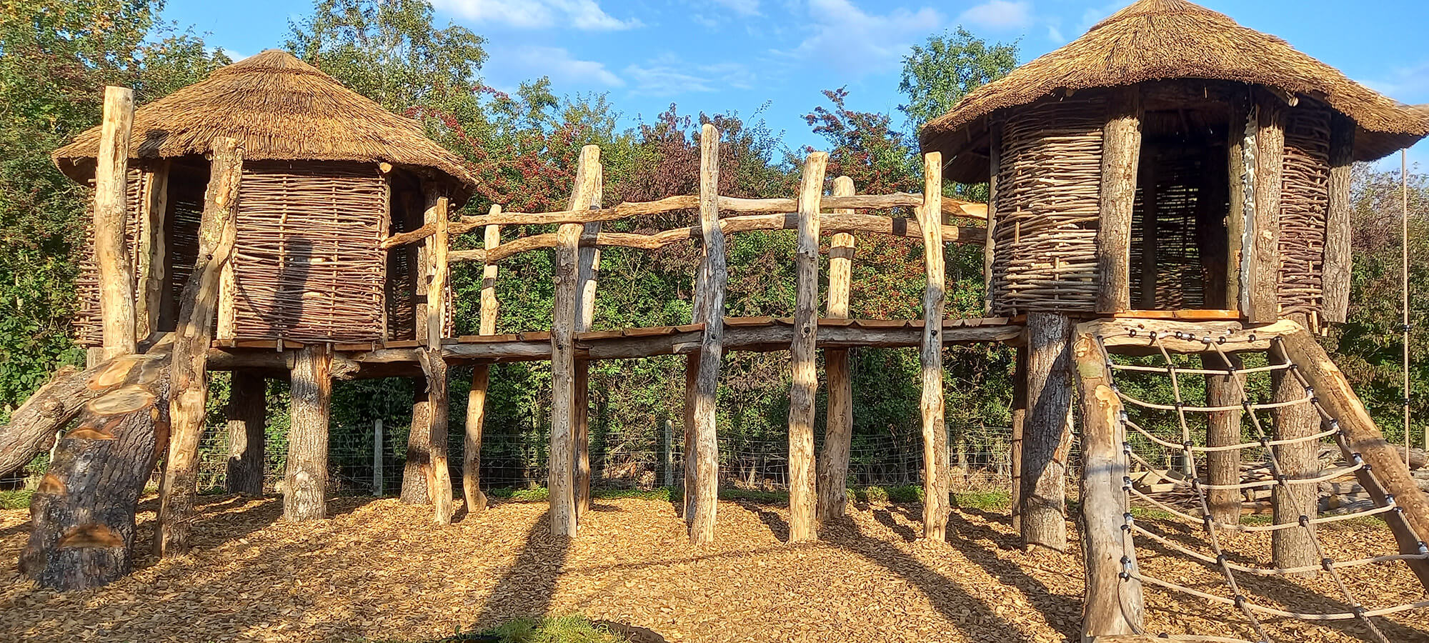 A stunning tree trunk archway leads to the play area where you will find a fortress tower, 'woodhenge' structure, log seating and more.