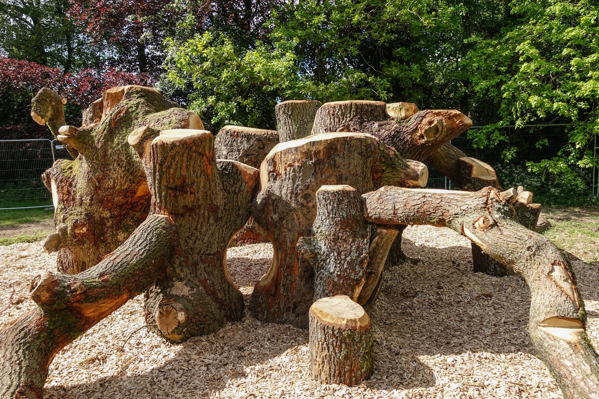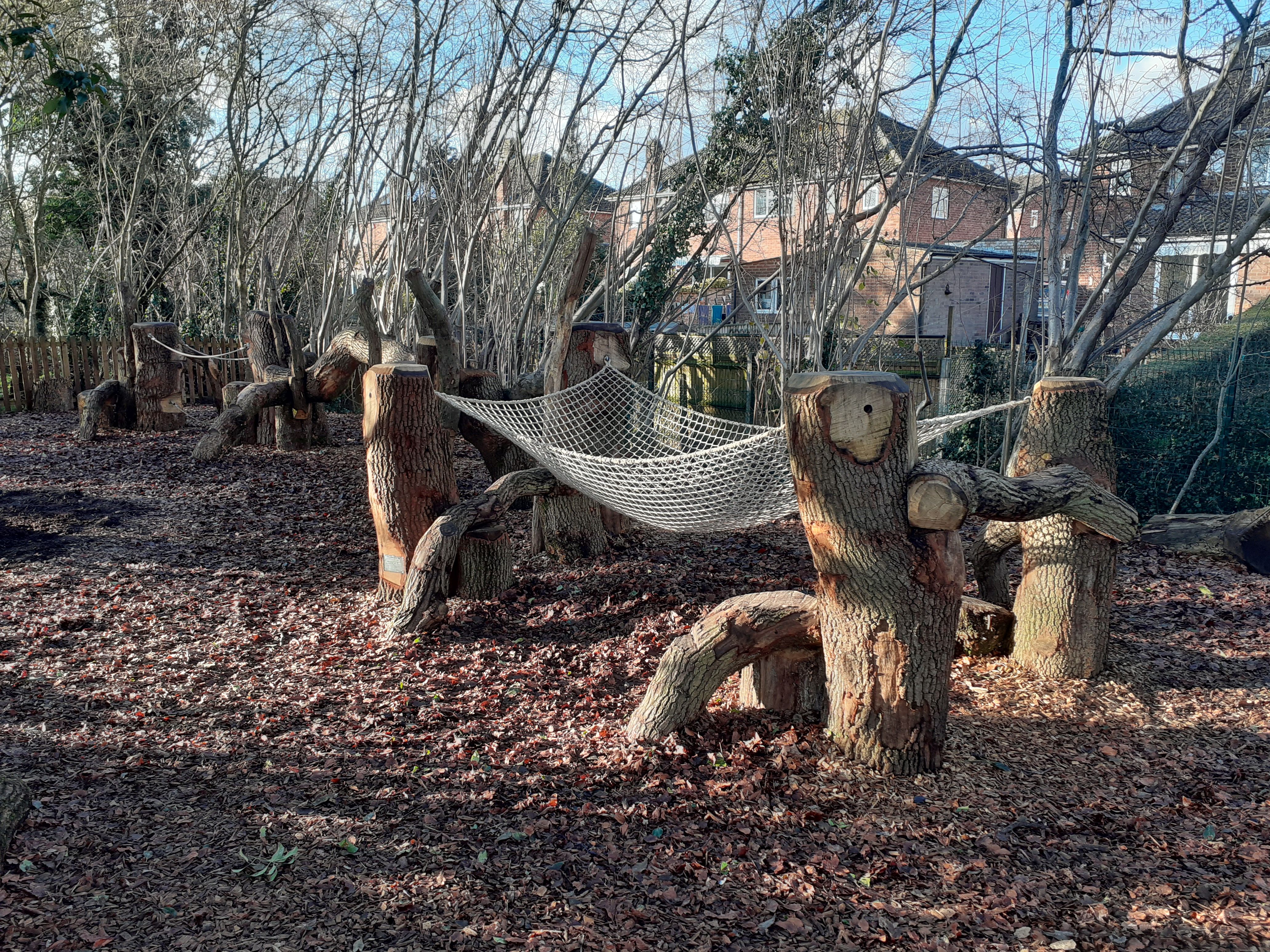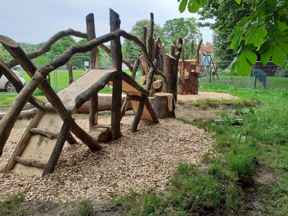 A large natural play feature that blends in perfectly as a natural play feature in a beautiful woodland at the school