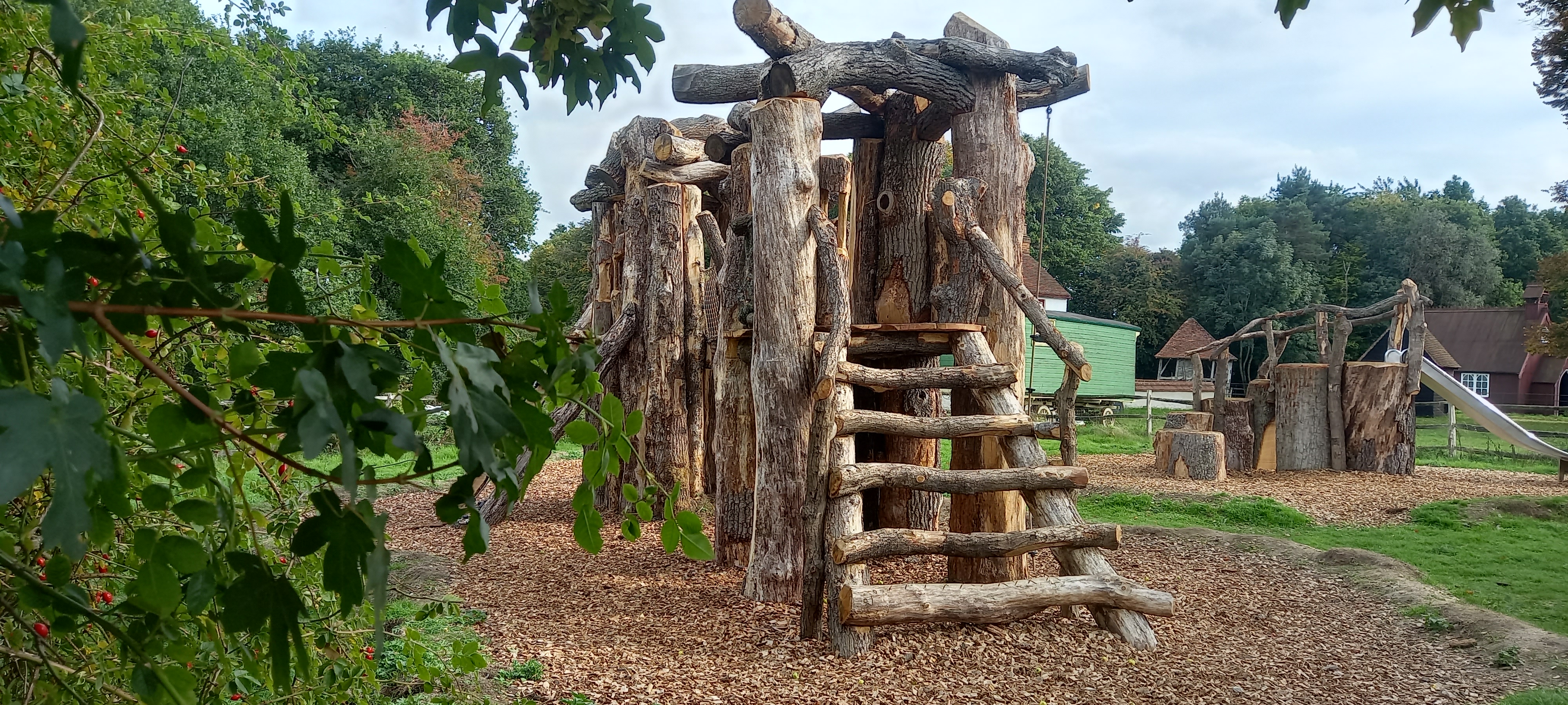 A stunning tree trunk archway leads to the play area where you will find a fortress tower, 'woodhenge' structure, log seating and more.