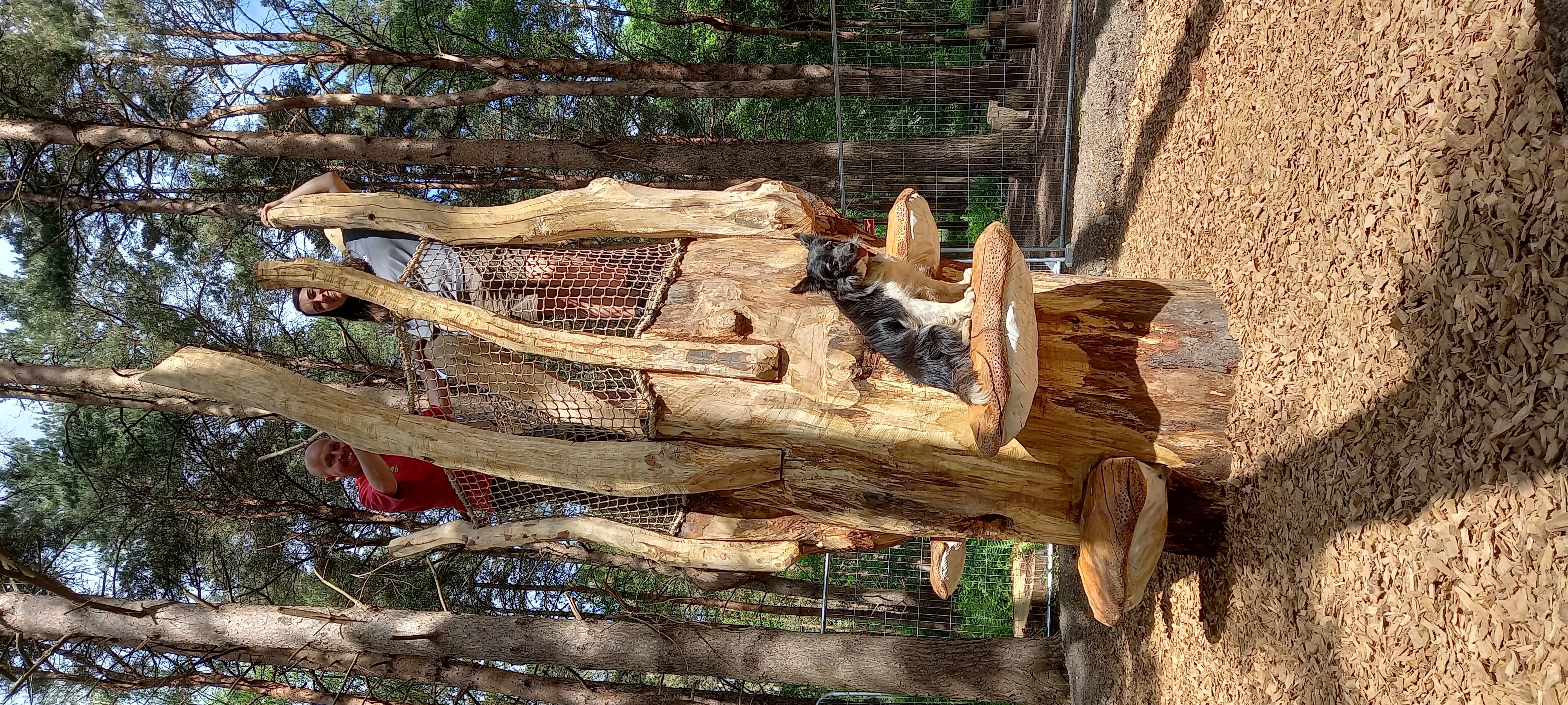 We used the spectacular natural oak to create a giant accessible nest swing, an oak climbing stump with bracket fungi, the Wildwood stage (for outdoor performances) and the Unstately Towers - a large tree trunk climbing feature with a rope tunnel between the towers. All of the structures are made from natural untreated oak and will slowly return their carbon store to the soil over many years as well as attracting life associated with deadwood. The bracket fungi we carved are made to look like real oak polypore fungi and double up as steps.